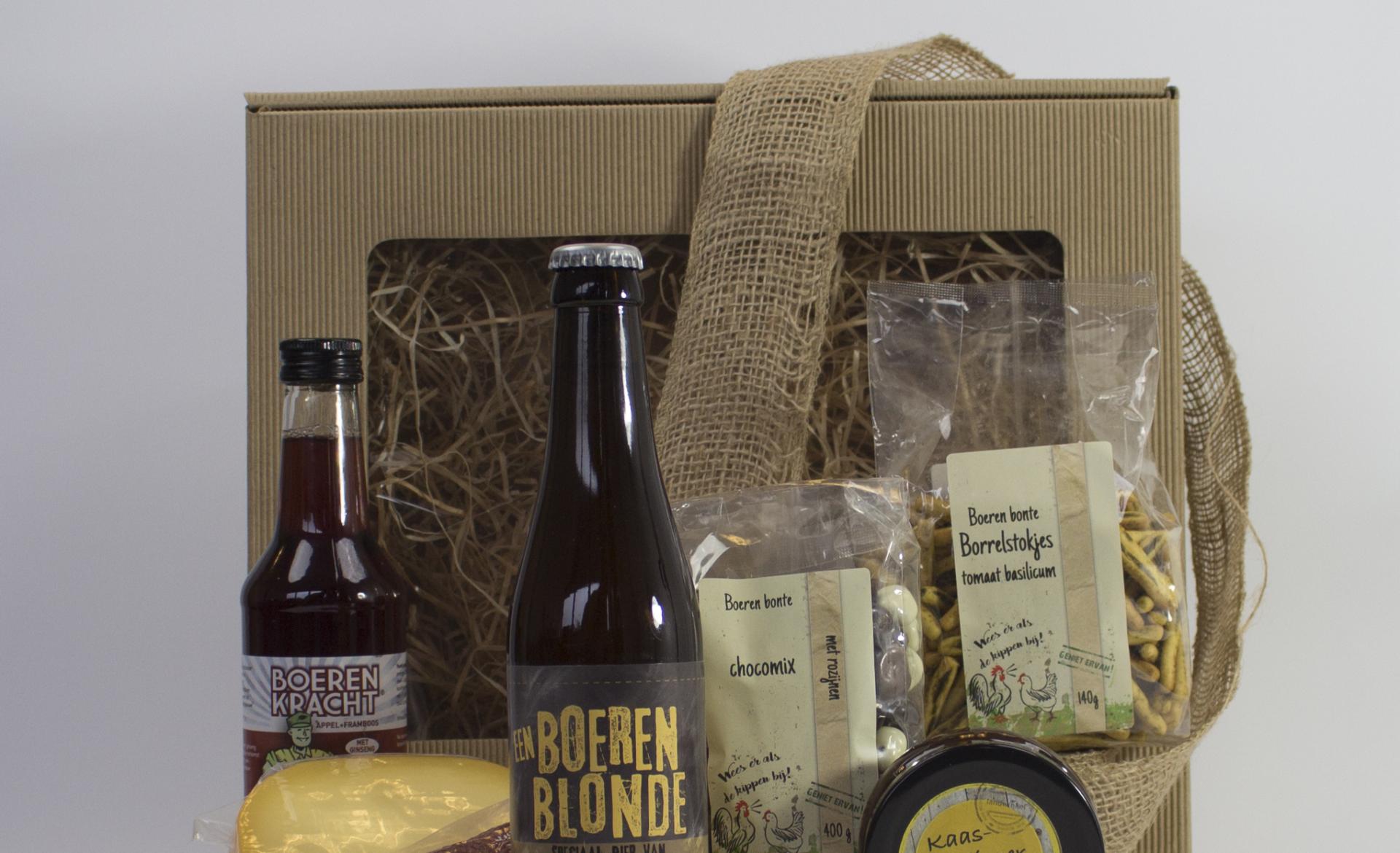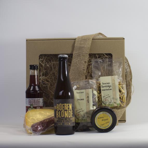 In deze box zitten o.a een lekker stuk kaas, een echte Boeren Blonde, Boerenkracht en wat lekkers om te knabbelen.