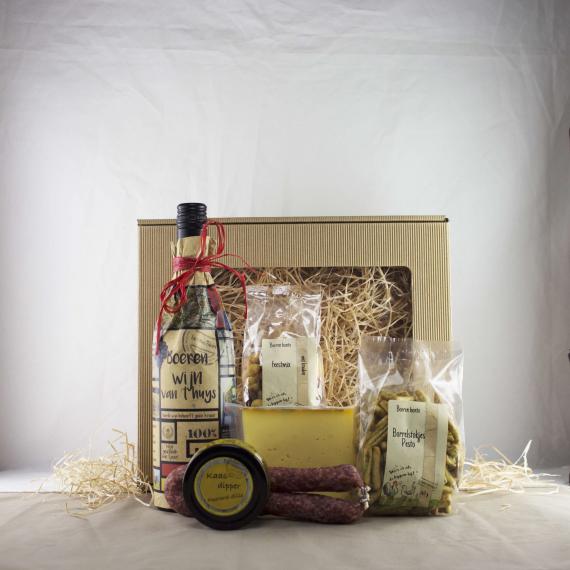 Delicatessenbox Boer Tom van onze Landwinkels kenmerkt zich door de fraaie fles kwaliteitswijn gehuld in een unieke verpakking. Drink hem met een stukje boerenkaas en worst. En heeft u onze smaakvolle ambachtelijke mosterd-dille dip al geproefd? Dat is smullen!